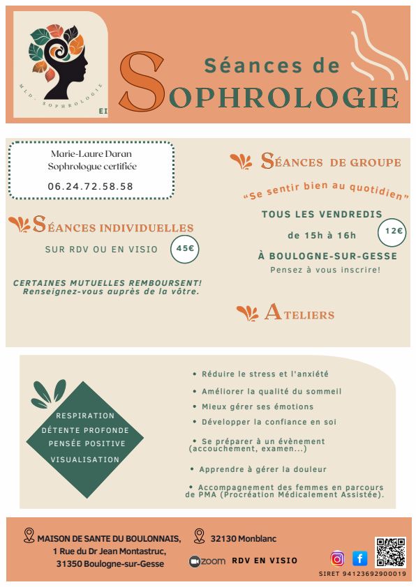 Séances individuelles - sur rdv au cabinet de Boulogne-sur-Gesse (31) ou à Monblanc (32), ou en visio.